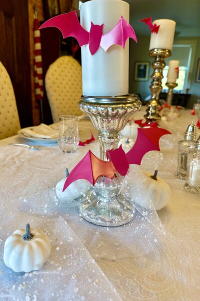 It could be a dilemma! Having a Halloween birthday. Our youngest granddaughter’s birthday is on Halloween. Last year we hosted her birthday. Her mom was on a mission’s trip so Jim and I volunteered. yHalloween tablescape was formal and sweet using the coors of white and pink. Often on special occasion and family dinners I like to set the table…